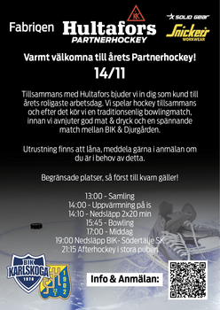 Tillsammans med Hultafors bjuder vi in dig som kund till årets roligaste arbetsdag. Vi spelar hockey tillsammans och efter det kör vi en traditionsenlig bowlingmatch, innan vi avnjuter god mat & dryck och en spännande match mellan BIK & Södertälje SK.