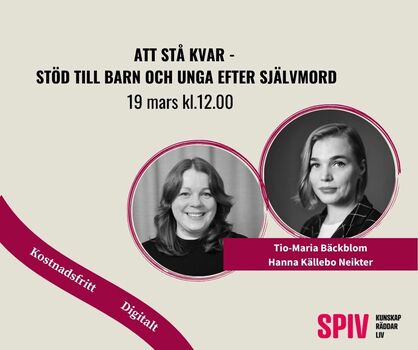 Under seminariet kommer Hanna Källebo Neikter och Tio-Maria Bäckblom, psykologer och projektledare vid Ericastiftelsen, att prata om hur vi tillsammans kan ge bättre stöd till barn och unga som förlorat någon i suicid eller på annat sätt berörts. Syftet är att stärka det förebyggande och stödjande arbetet, och att minska risken för psykisk ohälsa och egen suicidtanke hos barn och unga. Hanna och Tio-Maria presenterar aktuella insatser och erfarenheter från arbetet med barn, unga och deras familjer.
