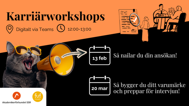 FUF och Akademikerförbundet SSR bjuder in FUF-medlemmar till två inspirerande och praktiska karriärworkshops med Johanna Finndin och Hedda Malmqvist, studentombudsmän på Akademikerförbundet SSR.