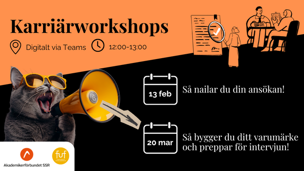 FUF och Akademikerförbundet SSR bjuder in FUF-medlemmar till två inspirerande och praktiska karriärworkshops med Johanna Finndin och Hedda Malmqvist, studentombudsmän på Akademikerförbundet SSR.