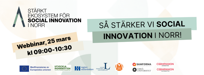 Är du nyfiken på vad vi tillsammans kan göra i norra Sverige för att stötta nytänkande sätt att möta samhällsutmaningar? Du kanske arbetar med innovations- och utvecklingsfrågor i en kommun, region, lärosäte eller civilsamhälle? Då är du välkommen att ta del av och samtala om exempel och lärdomar från projektet “Stärkt ekosystem för social innovation i norr” (SESIN).